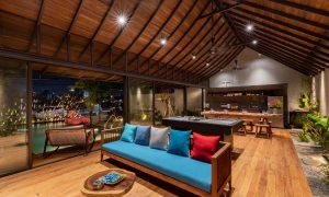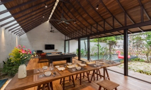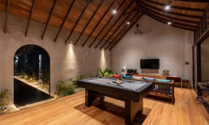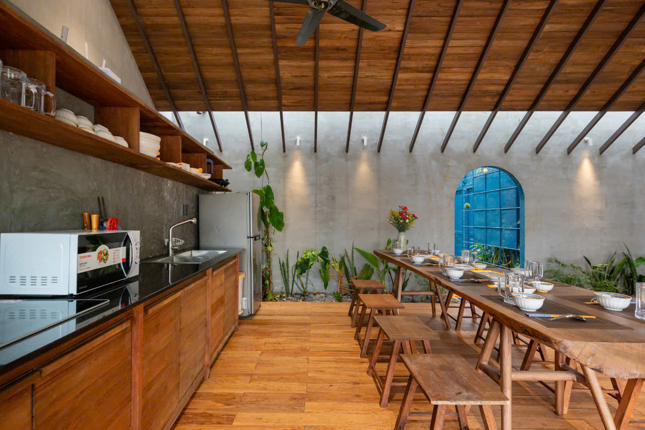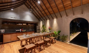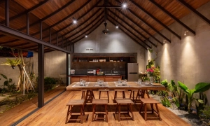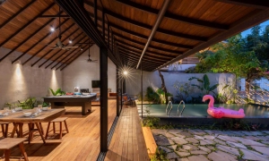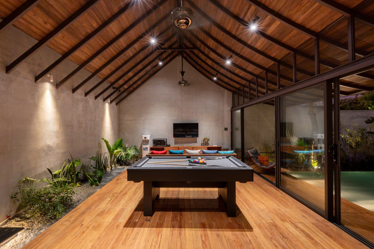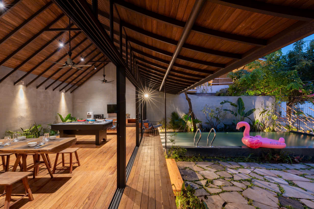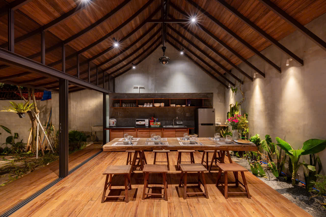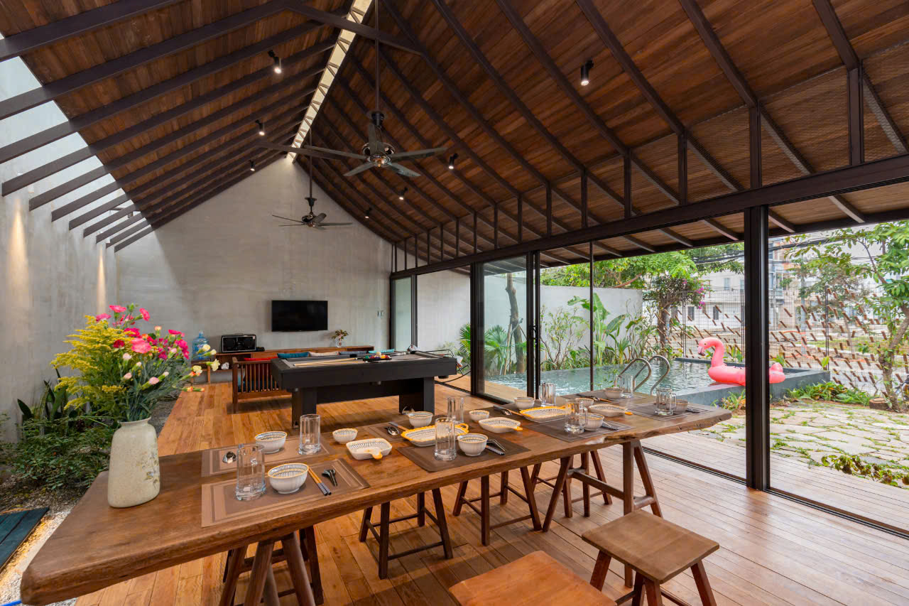 Villa được thiết kế trệt không lầu, rất thuận tiện cho đoàn đông, gia đình có người lớn tuổi hoặc trẻ nhỏ. Tổng thể không gian mở, kết nối liền mạch giữa phòng khách – bếp – sân vườn – hồ bơi, tạo cảm giác thoáng đãng và gần gũi.